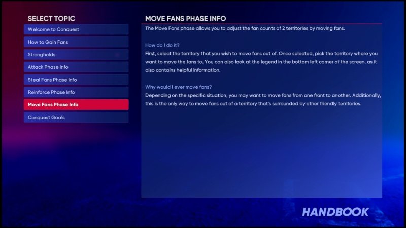 공격 단계가 시작될 때 즉시 잡을 수 있는 비어 있는 영역에 집중하십시오. 3개 지역을 정복하면 100만 명의 팬이 있습니다. 이것은 팬 분포를 강화하는 데 도움이 되어 요새를 공격할 때 더 많은 지원군을 추가할 수 있습니다. 요새에 맞서기 전에 더 많은 지원군이 있으면 신인 또는 베테랑 난이도를 잠금 해제할 확률이 높아집니다. 팬층을 보호하기 위해 베테랑 난이도 이상으로 플레이하지 마십시오.