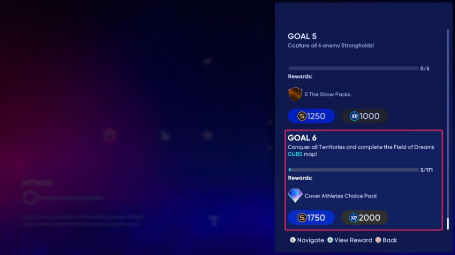 Field of Dreams용 Conquest 지도도 제공됩니다. 있다 특정 턴까지 거점을 점령할 목표가 없음. 시간을 내서 팬 훔치기 부분을 사용하여 임무에 대한 병렬 경험을 얻으십시오. 6개의 목표에 대한 보상이 있으며, 주로 모든 영역을 정복하기 위한 Cover Athletes 선택 팩입니다. 당신은 또한 지도를 완성하면 30,000 프로그램 경험치를 얻습니다.