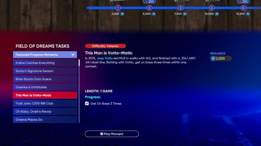 다음으로 수행 주요 프로그램 순간. 이것은 각 보스 카드에 연결된 순간입니다. 프랜차이즈의 올스타에는 30명이 있었지만, Field of Dreams에서 9개의 보스 카드를 위한 9개의 순간. 매 순간마다 2,000 경험치와 총 18,000개 이상의 경험치를 얻을 수 있습니다. 매 순간 플레이를 통해 얻을 수 있는 비트를 추가할 때입니다.