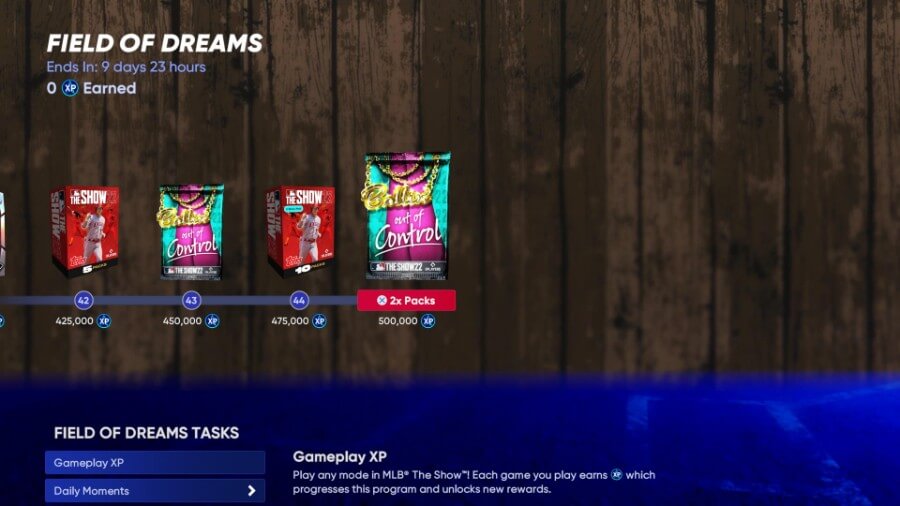 Field of Dreams 프로그램에는 45 또는 500,000 경험의 프로그램 레벨 상한. 일부 Headliners 팩과 최근에 추가된 Ballin’ out of Control 팩을 포함하여 프로그램 전반에 걸쳐 수집할 많은 팩과 아이템이 있습니다. 이제 각각 2,000 경험치를 제공하는 일반적으로 간단한 일일 순간을 완료하는 것을 잊지 마십시오.