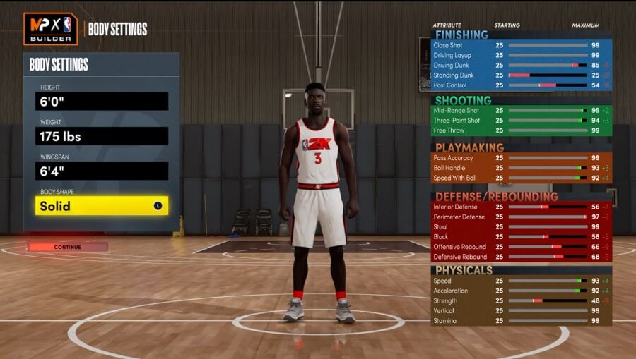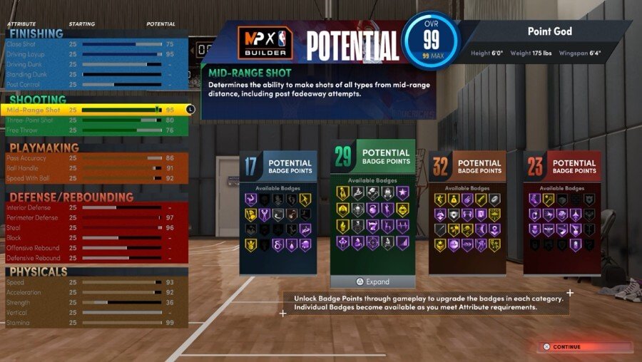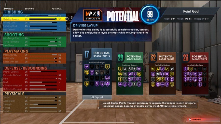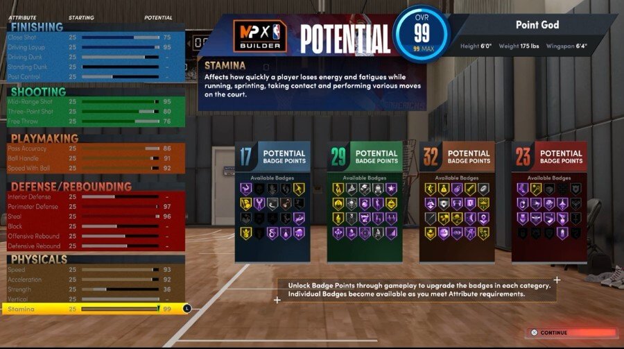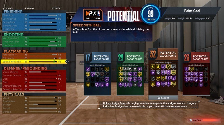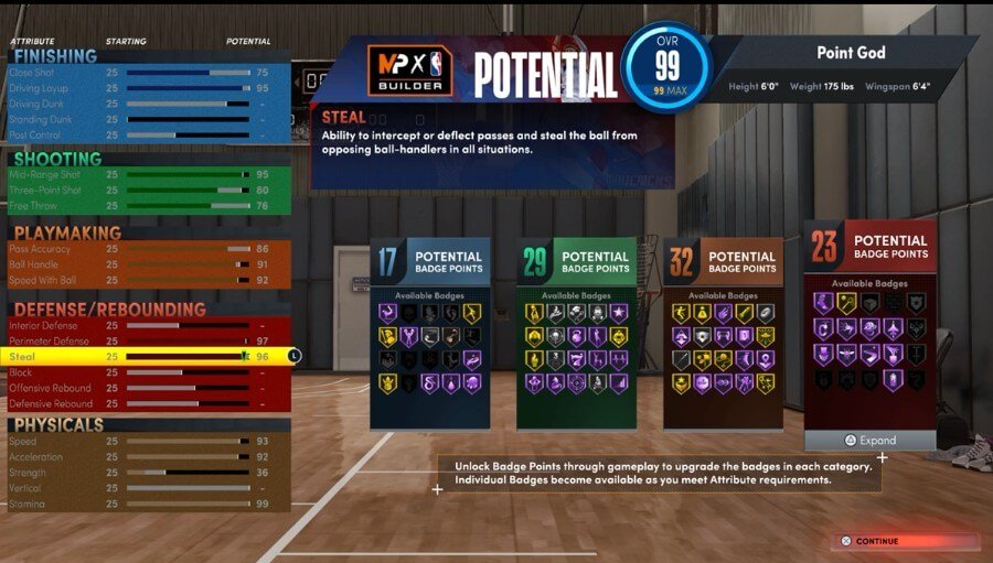 이것은 엘리트 속도와 플레이 메이킹 능력을 갖춘 더 작은 포인트 가드 빌드이므로 포스트 컨트롤 및 덩크 운전과 같은 기술에 너무 집중해서는 안됩니다.