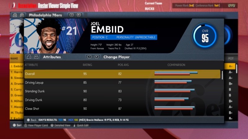 전체 평점 95점과 양방향 3레벨 득점원 원형을 갖춘 Embiid는 다시 한 번 NBA 2K22에서 가장 균형 잡힌 센터 중 하나입니다. 그를 보호하고 억제할 수 있는 규모, 기술, 운동 능력을 갖춘 센터는 리그에서 거의 없습니다.