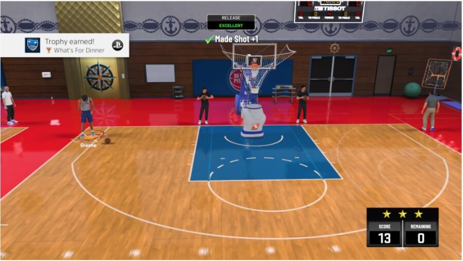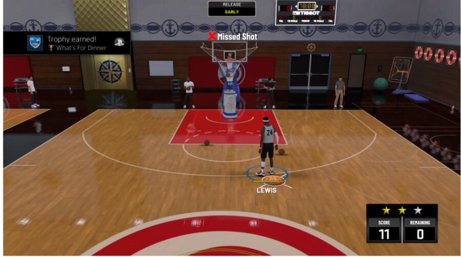 10번의 시도 모두에서 점수를 얻으면 이 훈련에서 별 3개를 얻을 수 있고 버킷 5개를 치면 이 훈련에서 별 2개를 얻습니다. CPU 상대는 당신에게 풀코트 프레스를 할 것이지만, 이것은 당신에게 빠른 휴식에서 오는 이점을 주기 위해 쉽게 통과할 수 있습니다.