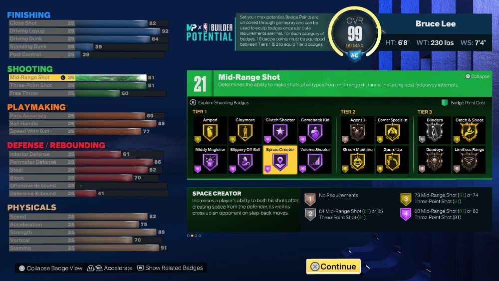 마무리를 잘 발달된 사격 무기와 결합하면 공격을 막을 수 없습니다. 21개의 잠재적인 배지 포인트로 명예의 전당 배지 5개, 금 배지 6개, 은 배지 1개 및 동 배지 3개를 이용할 수 있습니다. 코트의 모든 곳에서 슛을 하는 것은 고득점자가 되는 데 중요하기 때문에 이 빌드는 81개의 중거리 슛과 81개의 3점 슛을 제공하여 완벽한 패키지를 제공합니다. 스몰 포워드 포지션에서 더 중요한 스킬 중 하나는 중거리에서 어려운 샷을 만드는 것인데, 그렇기 때문에 Middy Magician과 Guard Up이 가치가 있습니다. 또한 Limitless Range 및 Deadeye와 같은 Tier 3 배지로 장거리 사격 능력이 부족하지 않습니다(Tier 3 배지 4가지 속성 그룹을 모두 잠금 해제하려면 Tier 1과 Tier 2 사이에 10개의 배지 포인트가 필요합니다.).
