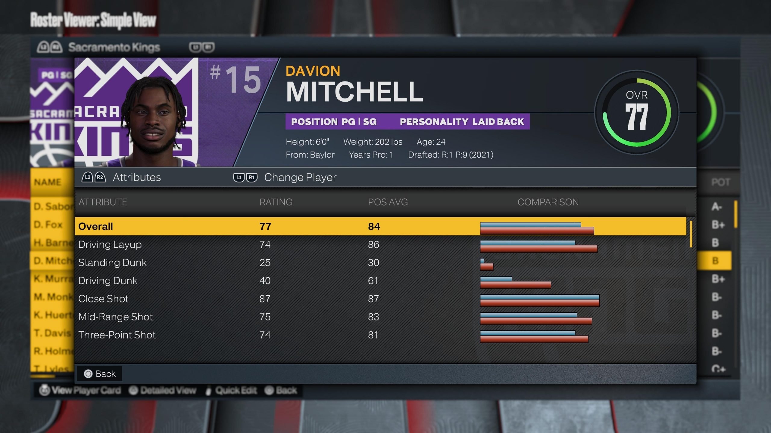 Mitchell은 87개의 Close Shot, 75개의 Mid-Range Shot, 74개의 Three-Point Shot으로 좋은 슈팅 능력을 갖추고 있습니다. 그의 86 볼 핸들과 82 Speed With Ball은 상대를 현혹시키고 82 패스 정확도와 패스 IQ를 사용할 수 있는 공간을 만드는 데 도움이 됩니다. Mitchell은 또한 Tyres Haliburton이 떠나면서 더 많은 시간을 보내야 하며 De’Aaron Fox를 선발로 나서야 합니다.