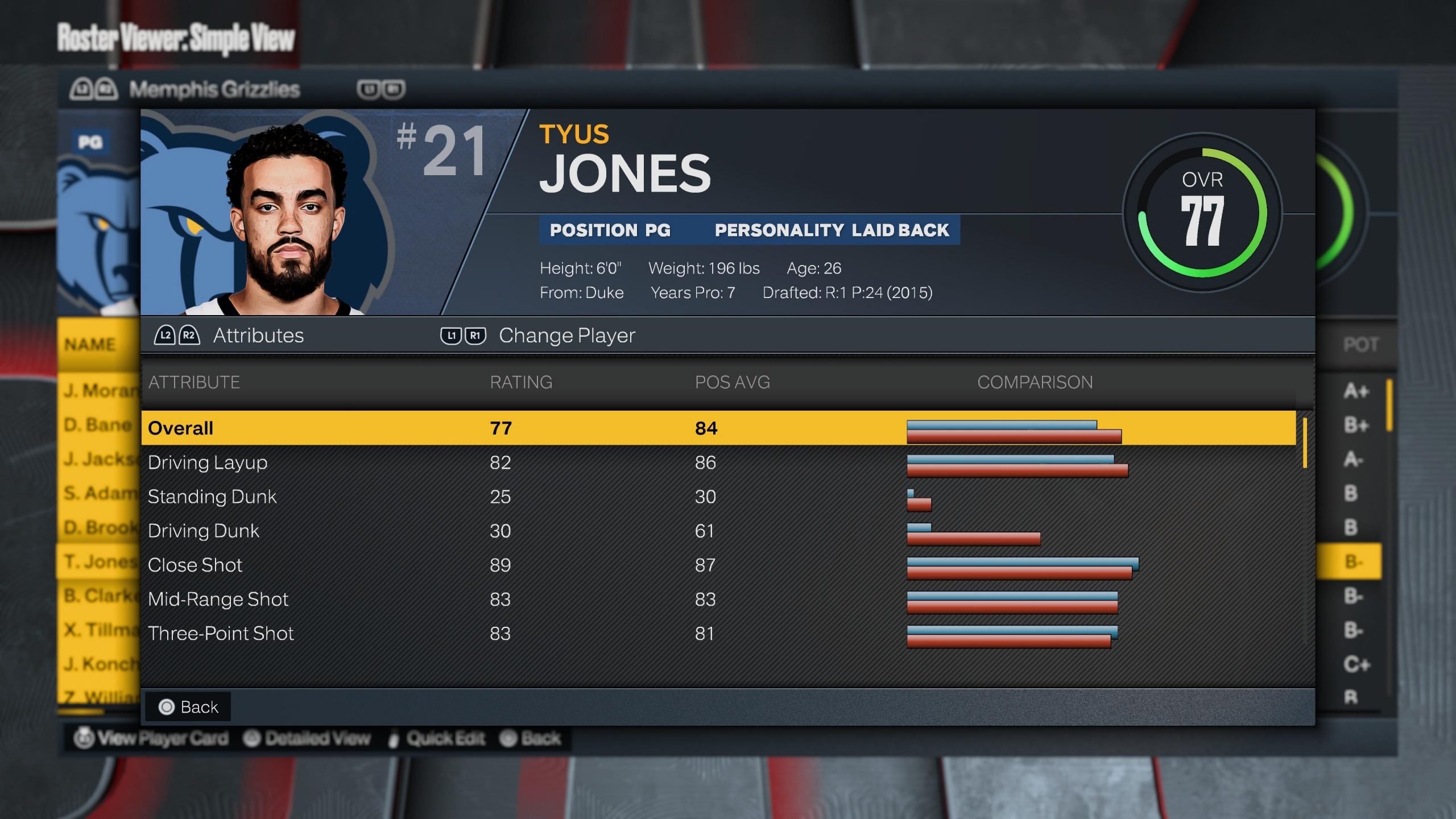 Jones는 89개의 클로즈 슛, 83개의 중거리 슛, 83개의 3점 슛과 82개의 드라이빙 레이업으로 환상적인 공격 수를 가지고 있어 모든 각도에서 위협적입니다. Jones의 다른 강점으로는 97 샷 IQ와 82 볼 핸들링이 있습니다.