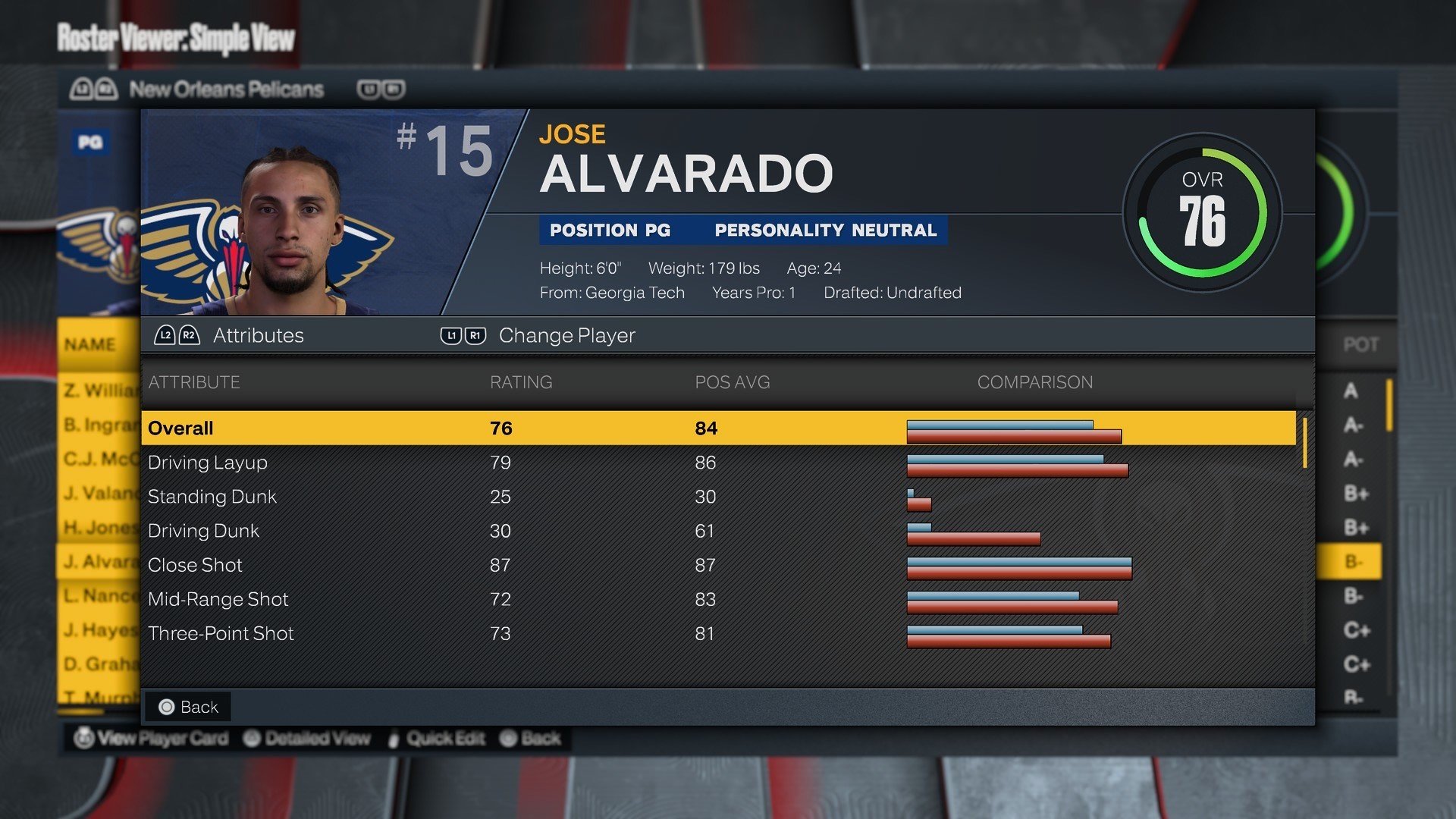 Alvarado는 특히 그의 98 스틸을 비롯한 몇 가지 양질의 통계를 가지고 있습니다. 이는 소유권을 되찾고 상대방이 패스하는 차선에서 다시 생각하게 만드는 데 도움이 됩니다. 그는 포인트 가드 포지션에서 최고의 수비수 중 한 명으로 널리 알려져 있습니다. 그의 공격 통계는 87개의 클로즈 슛과 79개의 드라이빙 레이업으로 괜찮은 수준이지만 합리적인 중거리 슛 72개와 3점 슛 73개입니다.