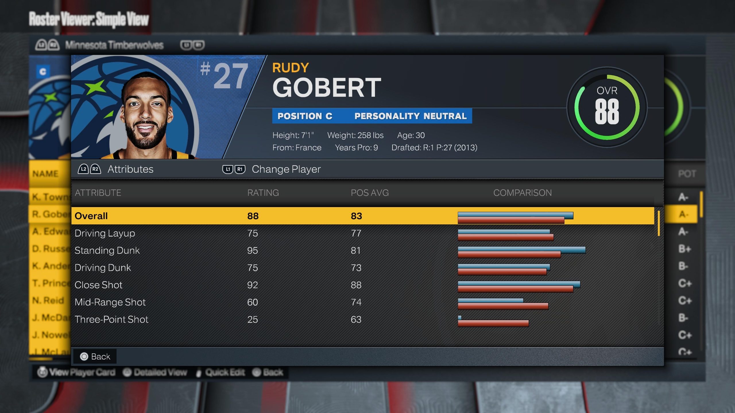 98개의 수비 리바운드와 87개의 내부 방어력을 보유한 Gobert는 모든 공격수에게 악몽입니다. 그의 수비력에 더해 그의 공격은 92개의 클로즈 슛과 95개의 스탠딩 덩크를 보여줍니다. 그는 픽앤롤과 공격 리바운드 후의 쉬운 턴백에 탁월합니다.