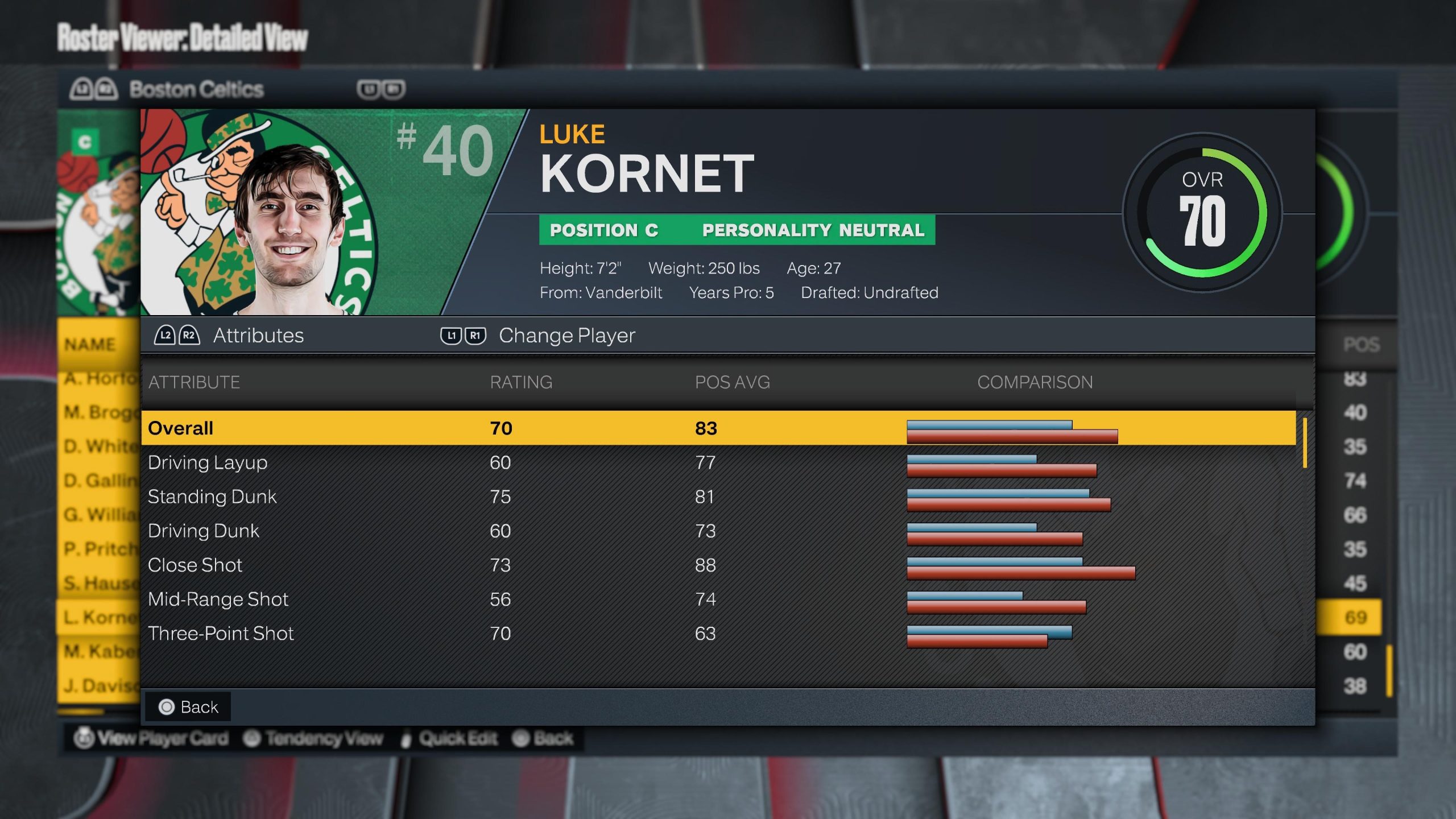 Kornet의 대학 성공이 전문적인 수준으로 이어지지는 않았지만 여전히 희망이 있으며 그를 80+ OVR 센터로 발전시킬 수 있습니다. 그는 평균 5.5 PPG와 2.6 RPG와 14.3 MPG 이상의 게임에서 3번의 시도에서 1.0 3개를 기록했습니다.