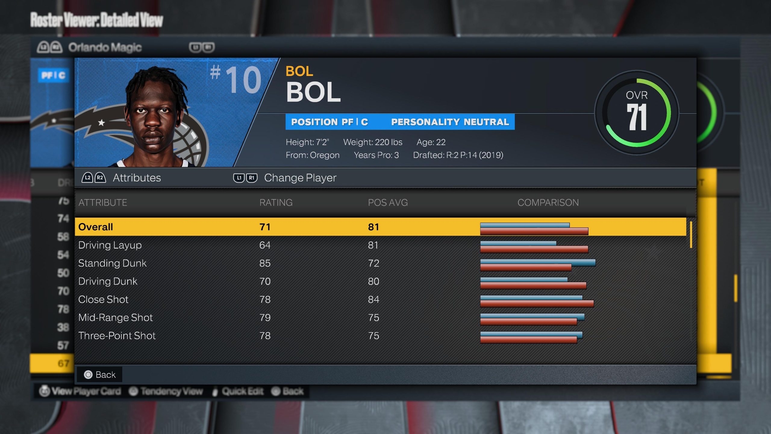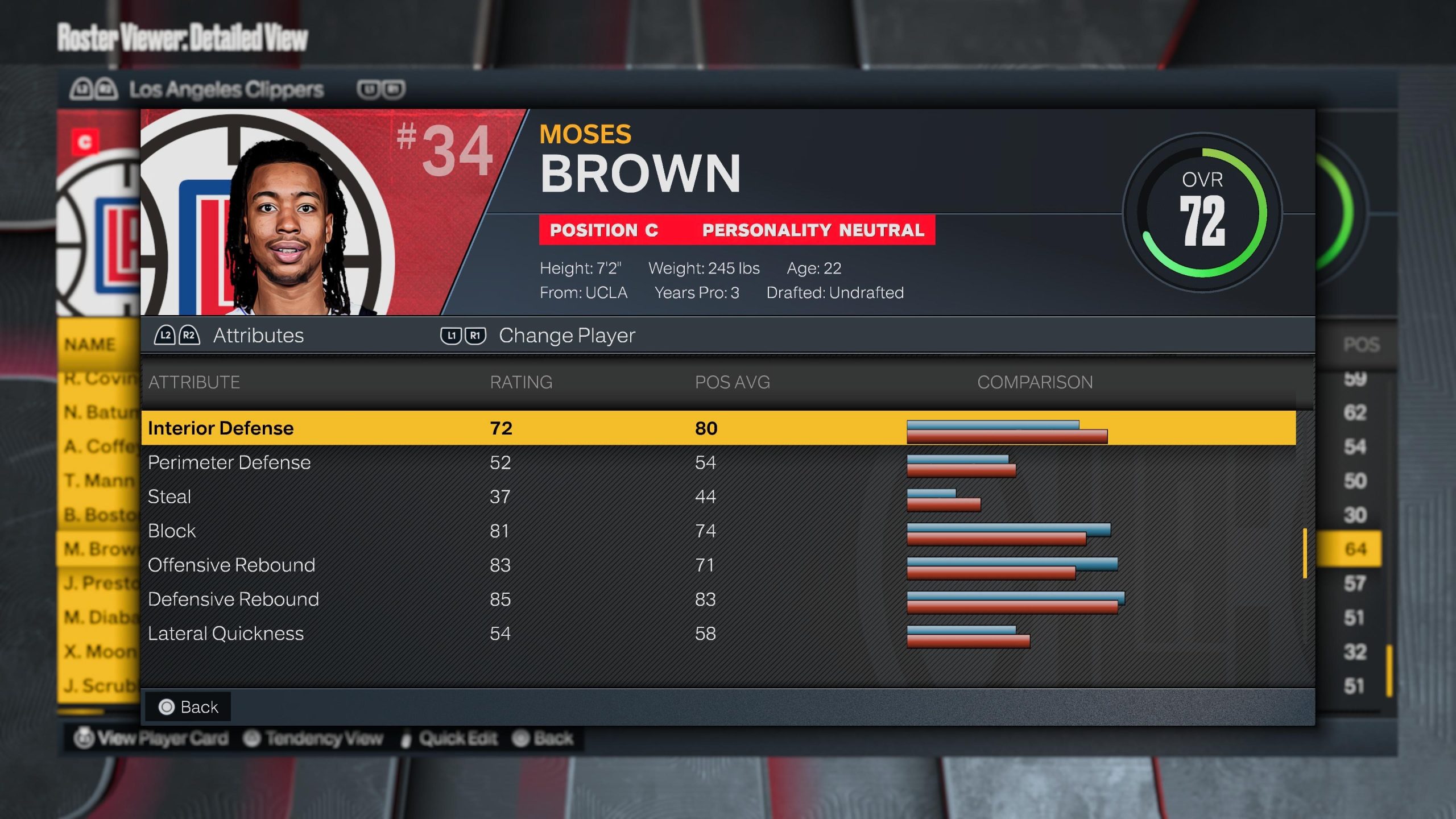 브라운은 85개의 수비 리바운드와 81개의 블록을 가지고 있어 공격적인 선수들에게 문제입니다. 공격에서 젊은 센터는 빠르게 진행되는 게임을 따라잡기 위해 종종 83의 공격 리바운드와 75의 체력으로 기여합니다.