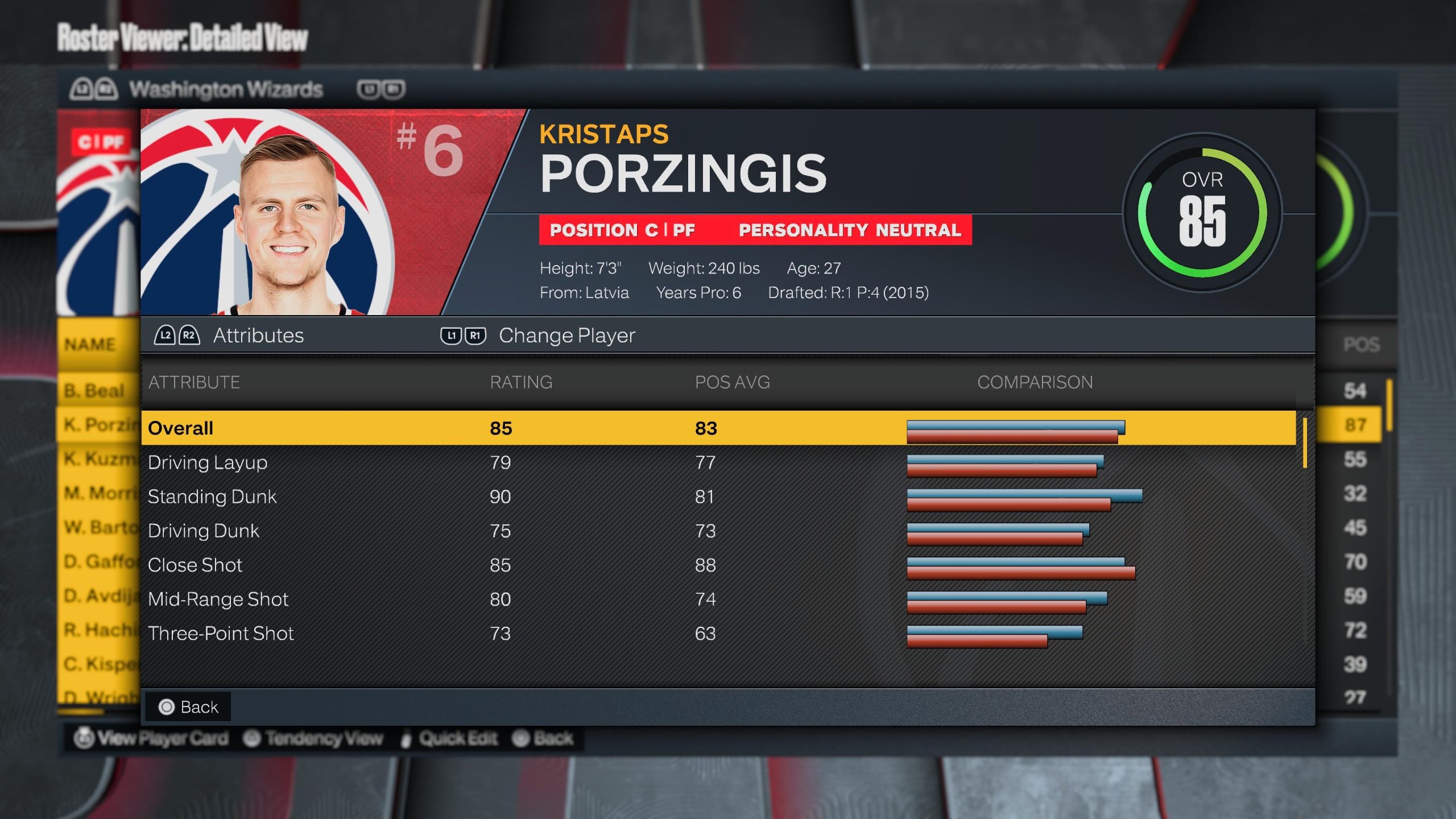 Porziņģis는 80개의 중거리 슛과 73개의 괜찮은 3점 슛을 보유한 키 큰 선수에게 인상적인 슈터입니다. 그는 또한 88 포스트 페이드로 포스트에서 위험할 수 있습니다. 라트비아는 또한 85 블록과 83 수비 리바운드로 수비에 능합니다.