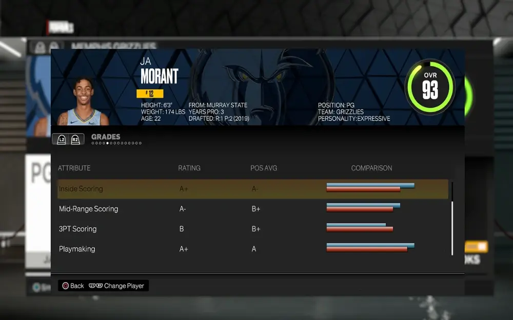 Ja Morant는 볼의 공격적인 측면에서 매우 높은 모터를 가지고 있으며 림에서 감히 그에게 도전하는 수비수에게 자비를 보이지 않습니다. 그는 실패한 덩크 시도에도 불구하고 거의 밤마다 하이라이트 릴을 만듭니다. Morant는 입이 떡 벌어지고 포스터화한 덩크 이후 팀을 화나게 하는 특별한 특성을 가지고 있습니다. 작년 플레이오프에서 Malik Beasley를 상대로 한 그의 덩크는 Grizzlies가 시리즈에서 우승하도록 밀어붙인 촉매제 역할을 했습니다. Morant는 전방위적인 공격 능력이 뛰어나지만 후방에서 슈팅 능력을 향상시킬 수 있습니다. 2021-22 시즌에 그는 평균 27.4득점, 6.7어시스트, 야투율 49%를 기록했습니다.