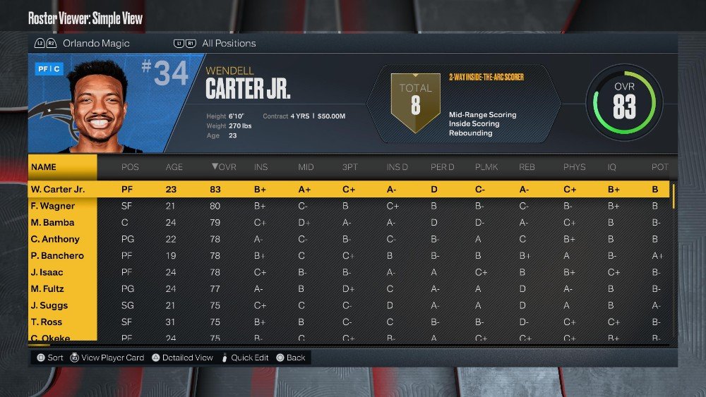 라인업: Cole Anthony(78 OVR), Jalen Suggs(75 OVR), Franz Wagner(80 OVR), Paolo Banchero(78 OVR), Wendell Carter, Jr.(83 OVR)