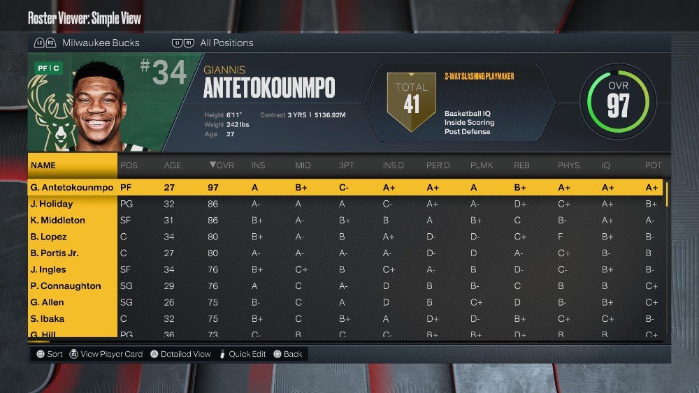 라인업: Jrue Holiday(86 OVR), Wesley Matthews(72 OVR), Khris Middleton(86 OVR), Giannis Antetokounmpo(97 OVR), Brook Lopez(80 OVR)
