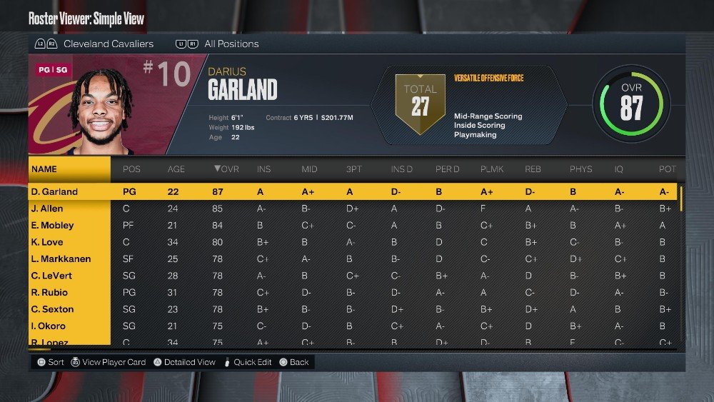 라인업: 다리우스 갈랜드(87 OVR), 도노반 미첼(88 OVR), 아이작 오코로(75 OVR), 에반 모블리(80 OVR), 자렛 앨런(85 OVR)