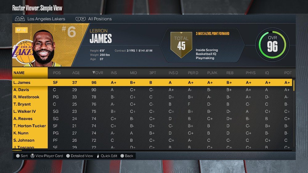 라인업: 러셀 웨스트브룩(78 OVR), 패트릭 비벌리(78 OVR), 르브론 제임스(96 OVR), 앤서니 데이비스(90 OVR), 토마스 브라이언트(76 OVR)