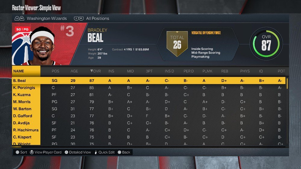 라인업: 몬테 모리스(79 OVR), 브래들리 빌(87 OVR), 윌 바튼(77 OVR), 카일 쿠즈마(81 OVR), 크리스탑스 포르징기스(85 OVR)
