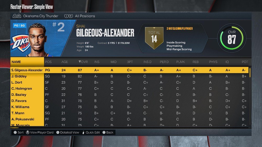 라인업: Shai Gilgeous-Alexander(87 OVR), Josh Giddey(82 OVR), Luguentz Dort(77 OVR), Darius Bazley(76 OVR), Chet Holmgren(77 OVR)