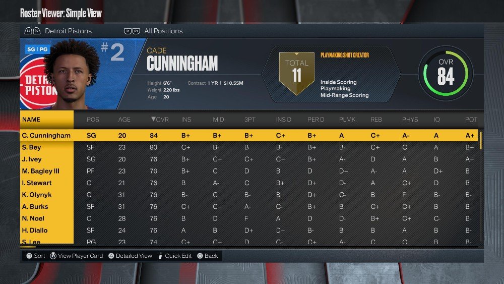 라인업: 제이든 아이비, 케이드 커닝햄(84 OVR), 사디크 베이(80 OVR), 마빈 베이글리 III(76 OVR), 이사야 스튜어트(76 OVR)