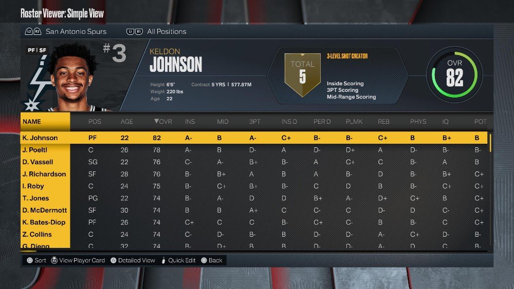 픽앤롤 선수와 스트레치 포워드로 가득 찬 팀과 함께 플레이메이킹 기회가 많이 있을 것입니다. 명단에는 Zach Collins, Keldon Johnson, Doug McDermott, Isaiah Roby와 같은 선수가 포워드 포지션에 포함되어 있으며 Josh Richardson, Devin Vassell 및 Romeo Langford가 가드 포지션에 있습니다.