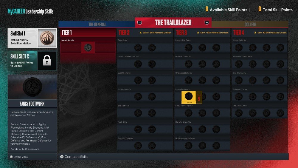 예를 들어 The General의 기본 Tier 1 스킬은 견고한 기초. Solid Foundation은 다음과 같은 보상을 제공합니다. 민첩성과 플레이메이킹에 약간의 부스트와 팀원 증가 그리고 B Teammate 등급 달성 시 활성화. Trailblazer의 기본 Tier 1 스킬은 간단하게 유지. Keep It Simple은 다음과 같은 보상을 제공합니다. 인사이드 및 미드레인지 슈팅에 약간의 부스트와 함께 팀원에게 더 큰 부스트를 제공하고 5발을 쏘면 활성화됩니다.. 이 Tier 1 스킬은 각각 1개의 스킬 포인트를 소모합니다.