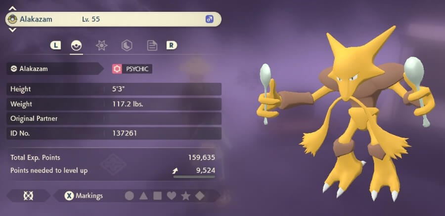 Alakazam은 두 가지 물리적 공격, Psycho Cut과 Zen Headbutt를 배웁니다. 학습하는 다른 공격에는 Calm Mind, Recover 및 Teleport와 같은 상태 공격과 함께 Confusion 및 Psychic이 포함됩니다. 또한 두 가지 사이킥 유형의 약점을 커버하는 Dazzling Gleam, Shadow Ball, Ice Punch를 배울 수 있습니다.