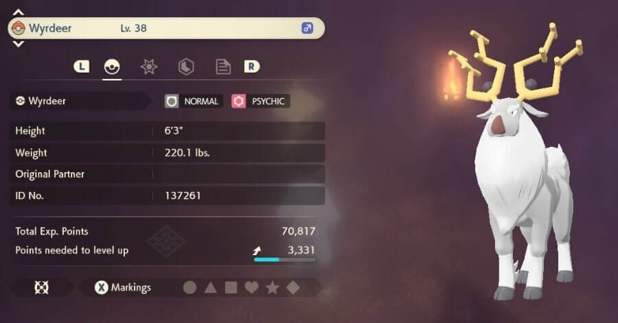 Wyrdeer는 보조 사이킥 유형이 있는 일반 유형입니다. 그러나, 그것은 격투를 약점으로 추가하지 않음, 사이킥 타입이기 때문에 일반 데미지로 돌아갑니다. 노멀 타입이기도 하다. 고스트 유형의 피해를 무효화합니다. 식별 이동 후가 아닌 한; 이것은 Wyrdeer가 벌레와 어둠에만 약함.