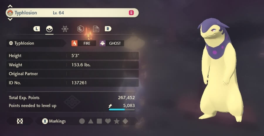 Hisuian Typhlosion은 Cyndaquil의 최종 진화의 Hisuian 전용 형태입니다. 순수한 화염 유형의 미래 Johto 버전과 달리 Hisuian Typhlosion은 기본 통계 합계가 약간 다른 화염 및 유령 유형입니다. Hisuian Typhlosion은 총 534개로 동일하지만 특수 공격(119)에서 더 큰 부스트를 위해 약간의 속도와 HP를 교환합니다. 이것은 화염 방사기 및 섀도 볼과 같은 두 가지 유형의 많은 특수 공격을 사용하는 데 도움이 됩니다.