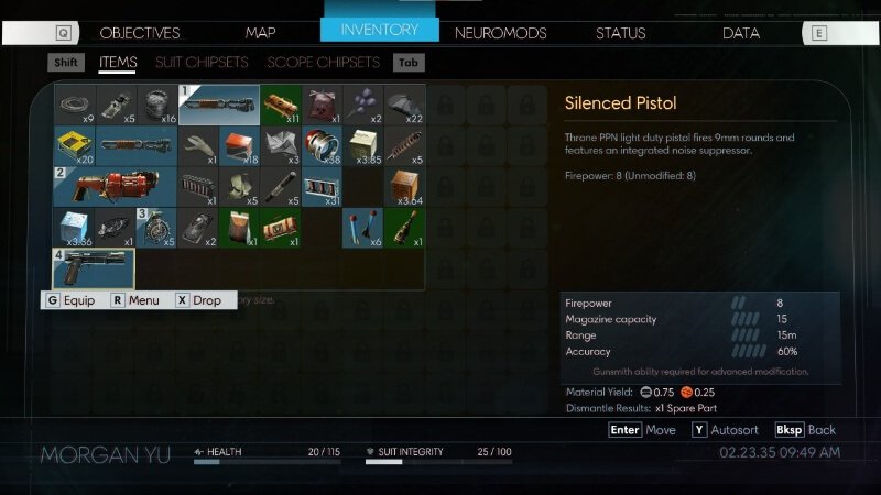 Prey의 인벤토리 공간은 제한되어 있습니다. 약 30개의 슬롯으로 시작하여 캐릭터 슈트 업그레이드의 일부로 96개로 업그레이드할 수 있습니다. 일부 품목은 하나 이상의 슬롯을 차지하므로 사용 가능한 슬롯 수는 품목 크기에 따라 다릅니다. 또한 맵 전체에 쓰레기 재활용 업체가 퍼져 있어 인벤토리 공간을 확보하고 그 대가로 제작 재료를 제공하는 데 도움이 됩니다.