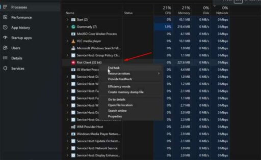 작업 관리자를 통해 Riot Vanguard를 포함한 모든 Riot Games 프로세스를 닫습니다.