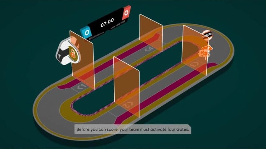 이제 첫 번째 랩을 만들어 골문을 연 후, 1점을 얻을 수 있습니다. 두 바퀴를 돌면 당신은 3 점을 얻을 수 있습니다. 어떻게든 소유권을 잃지 않고 3랩을 완주했다면, 5점을 획득하여 경기를 종료할 수 있습니다. 다만, 볼이 노크되어 상대팀에 의해 회수된 경우에는 골이 닫히고 공을 회수한 후 모든 게이트를 다시 실행해야 합니다..
