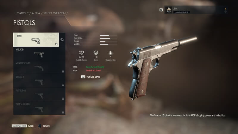 M1911은 임무를 시작할 때 주어지는 권총입니다. 3차 무기의 목적을 충실히 수행하기 때문에 6가지 권총 옵션 중에서 두 번째로 좋습니다.