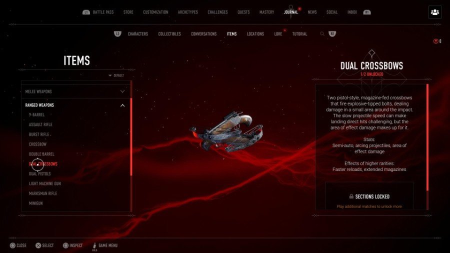 흥미로운 무기인 이중 석궁은 표준 석궁과 기능이 다릅니다. 표준은 적의 눈을 멀게 하고 약간의 피해를 주는 유독 가스가 있는 볼트를 해제합니다. 듀얼 석궁 대신 볼트가 있습니다. 폭발하는 볼트로 효과 범위를 갖습니다.. 발사 속도가 느리고 볼트의 속도로 인해 속사에 적합하지 않습니다. 그러나 그 효과 범위는 실제로 공격하지 않고도 적에게 피해를 줄 수 있음을 의미합니다. 볼트라는 것을 기억하십시오. 아치형 궤도를 따라가다. 더 높은 희귀도에서 이중 석궁은 더 빠른 재장전과 확장된 탄창을 받습니다. 옥상에서 듀얼 석궁을 사용하는 것이 가장 좋습니다.