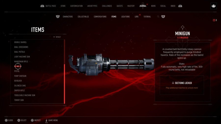 미니건은 슈팅 게임의 필수품으로, 대구경 탄약은 적을 파괴합니다. 미니건을 사용하는 대부분의 게임과 마찬가지로, 총은 발사를 예상하여 회전하는 방아쇠를 잡고 있을 때 시작하는 데 1~2초가 걸립니다. 물론, 그것은 게임에서 아마도 가장 높은 발사 속도를 가진 완전 자동입니다. 저널에 따르면 미니건은 업그레이드가 없는 것으로 보이며 미니건에는 한 가지 큰 단점이 있습니다. 300발을 끝내고 나면 미니건을 재장전할 수 없으며 무기를 버려야 합니다.. 그래도 300발을 잘 사용할 수 있다면 다른 총이 필요하지 않을 수도 있습니다.