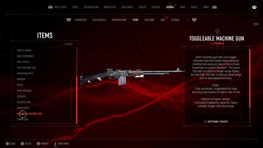 게임에서 가장 독특한 총일 수 있는 Toggleable Machine Gun은 다음과 같은 이유로 명명되었습니다. 더 높은 정확도 또는 더 높은 발사 속도 간에 전환. 전자는 더 긴 범위에서, 후자는 정확도가 떨어지는 근거리에서 원할 것입니다. 토글 가능한 측면을 제외하고 이 총은 손상 및 탄창 용량 측면에서 이 목록에 있는 다른 기관총과 유사합니다. 더 높은 희귀도에서 전환 가능한 기관총은 더 큰 탄창, 더 빠른 재장전 및 더 긴 범위를 얻습니다.