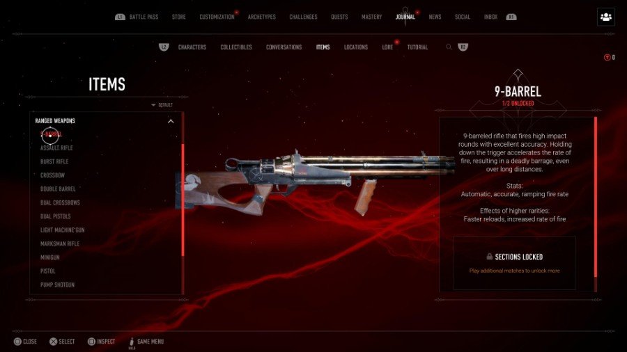 9-Barrel은 흥미로운 총입니다. 그것은 더 나은 반동을 위해 뒤쪽에 안정화 그립을 가지고 있으며, 이는 사용을 고려할 때 필요합니다. 높은 구경의 탄약 완전 자동입니다. 9-Barrel을 돋보이게 하는 것은 방아쇠를 누르고 있는 동안 발사 속도가 증가합니다. 더 긴 범위에서도 여전히 뛰어난 정확도를 유지합니다. 희귀도가 높을수록 재장전 및 발사 속도가 증가합니다. 대체로 9-Barrel은 초보자와 적에게 너무 가까이 가는 것을 좋아하지 않는 사람들에게 훌륭한 무기입니다.