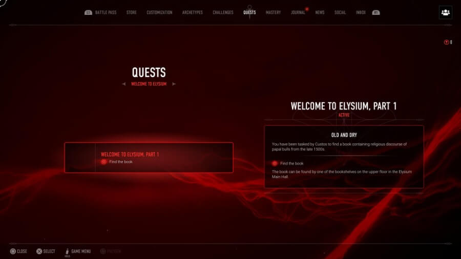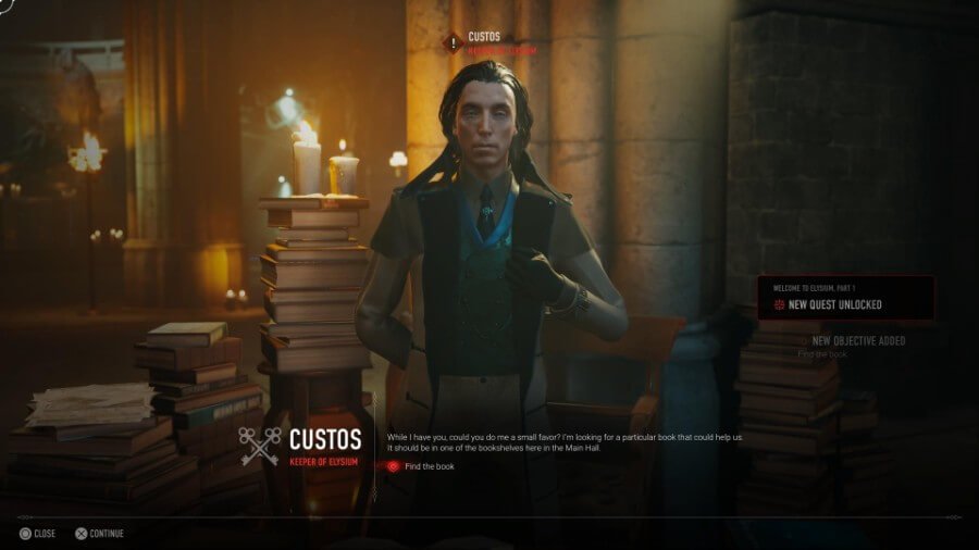 Custos는 상황에 대한 약간의 배경 지식을 제공한 다음 그에게 책을 찾아달라고 요청할 것입니다. 그는 단지 그것이 그들을 도울 수 있다고 말합니다. 운 좋게도 Elysium에서 상호 작용 가능한 것으로 눈에 띄는 책은 단 한 권뿐입니다.
