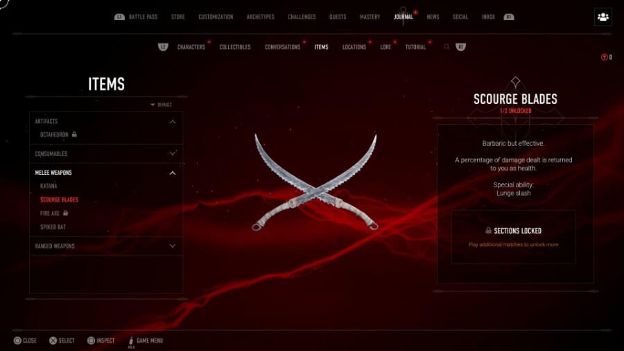 주변을 탐색하면 많은 항목을 볼 수 있습니다. 그들에게 보라색 개요. 저널의 항목을 잠금 해제하려면 이것들(대부분이 무기임)을 검사하십시오. 이것이 별거 아닌 것처럼 보일 수 있지만 저널은 실제로 유익합니다. 특별한 능력, 통계 및 더 높은 희귀도의 효과가 있는지 알려줍니다. 무기와 아이템(하나의 유물 포함!)에 대한 추가 정보는 해당 무기로 플레이하고 적을 처치할 때까지 잠겨 있습니다.