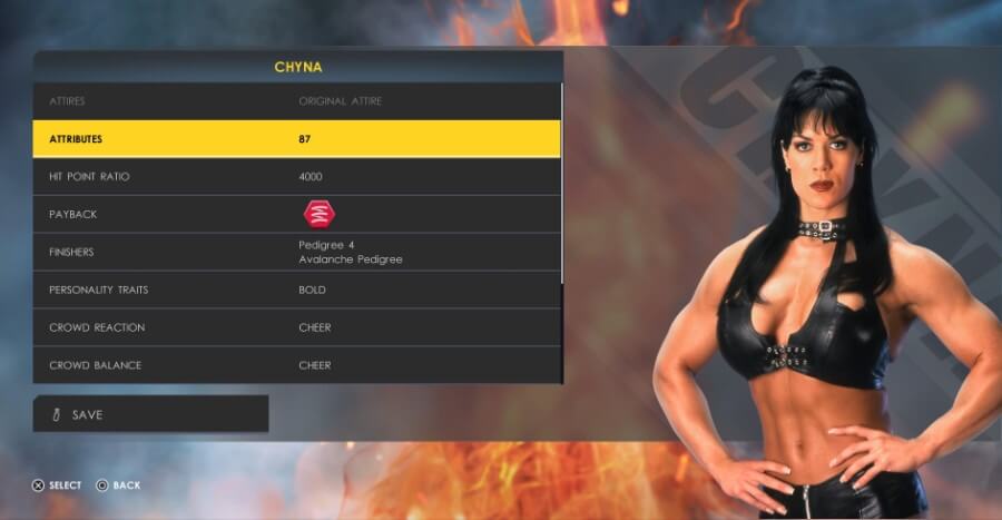 Chyna의 무브 세트는 그녀의 외모와 클래스에서 알 수 있듯이 파워 무브에 맞춰져 있습니다. 그녀의 피니셔는 그녀가 가계도와 눈사태 가계도를 사용하기 때문에 더 새로운 WWE 팬들에게 친숙하게 보일 것입니다. 물론 이는 숀 마이클스와 함께 DX의 공동 리더였던 트리플 H가 마이클의 은퇴 이후 이어받은 행보다. Chyna는 또한 매우 팬 친화적 인 입구를 가지고 있습니다.