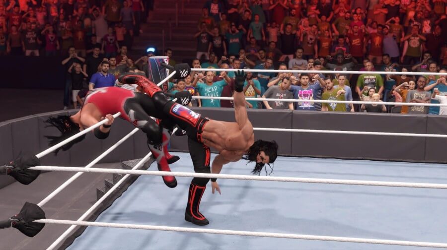 둘째, 상대방을 로프에 대고 유도한 다음 메시지가 표시되면 Rumble 피니셔의 경우 R2 + X 또는 RT + A를 누르십시오.. 레슬러에 따라 피니셔가 다릅니다(너무 많지는 않지만). 세스 롤린스는 그림과 같이 슈퍼킥을 쳤지만 케인은 예를 들어 초크슬램을 쳤습니다.