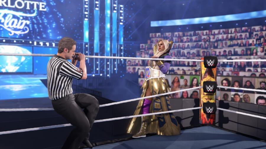 그녀는 그녀의 존재로 그녀의 “충성스러운 신하들”에게 특권을 주는 것처럼 경사로에서 포즈를 취하고 회전할 것입니다. 그녀는 천천히 링으로 향하고 실제 생활과 마찬가지로 주심이 자신을 위해 로프를 낮추도록 요청합니다. 실생활의 심판들은 그것이 그들의 일이 아니기 때문에 그녀의 요구를 묵인한 것에 대해 관찰자들로부터 심한 비판을 받았지만, 그것은 Flair의 성격에 완벽하게 맞는 경멸의 감각을 더합니다.