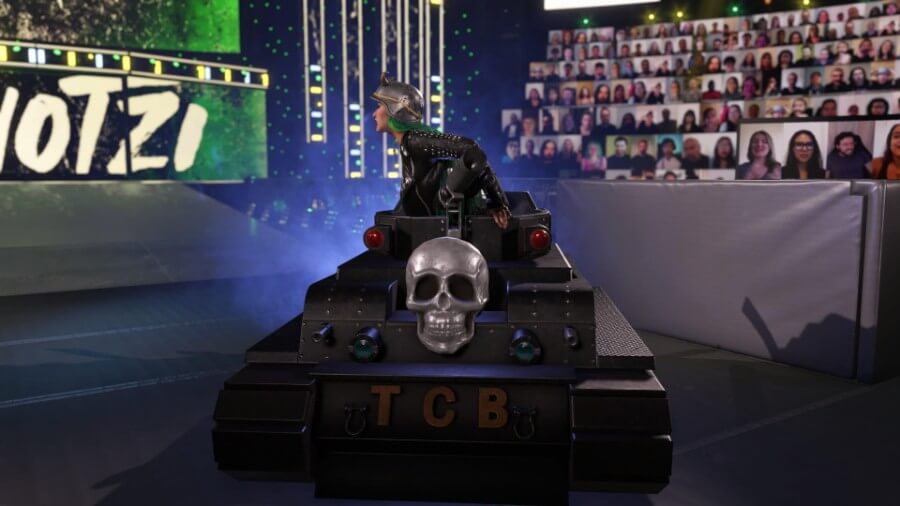 여기에서 Banks는 그녀와 동의어가 된 약간의 딥 앤 포즈를 하기 전에 그녀의 “Boss Time” 주얼리와 함께 포즈를 취합니다. 그녀는 링 위로 펄쩍 뛰며 군중을 날려버리고 링을 칩니다. 그녀는 입장을 마치기 전에 자신이 “The Boss”임을 강조하며 다시 포즈를 취합니다.