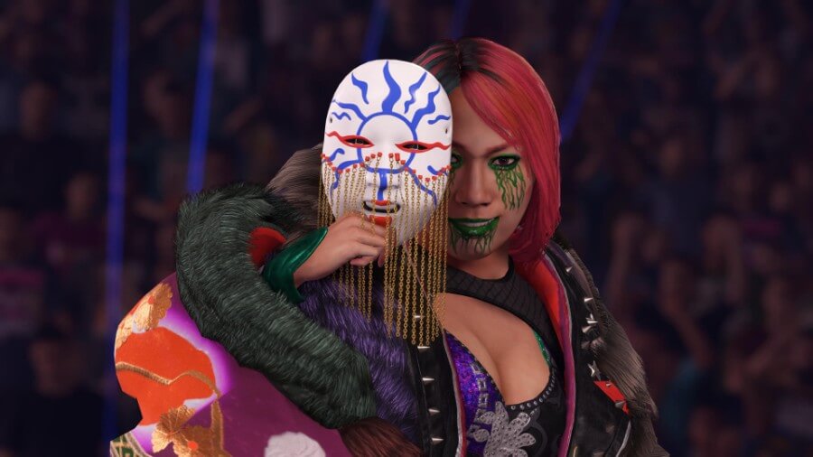 WWE 2K22에서 사용할 수 있는 최고의 여성 레슬러 중 한 명인 Asuka도 멋진 입장을 가지고 있습니다(미안합니다, Carmella!). 그녀의 음악은 가사를 치기 전에 처음에 반복되는 음표로 히트하여 그녀의 외모에 큰 도움이됩니다. 그녀는 화려하면서도 화려해 보이지 않는 큰 로브와 얼굴에 신비한 가부키 가면을 쓰고 있습니다.