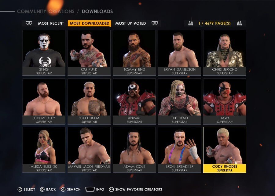 옵션을 클릭하면 L1 및 R1 또는 LB 및 RB로 변경할 수 있는 “가장 최근” 탭으로 자동 이동합니다. 다른 두 옵션은 “가장 많이 다운로드됨”과 “가장 많이 투표함”입니다. “Superstars” 아래에서 다운로드할 수 있는 게임에 없는 레슬러의 상세한 창작물이 있음을 알 수 있습니다. 위의 그림에서 NXT 레슬러 Solo Sikoa와 Bron Breakker는 다른 레슬링 선수인 The Fiend와 교제하기 전에 Alexa Bliss의 2020 버전에 합류했습니다.