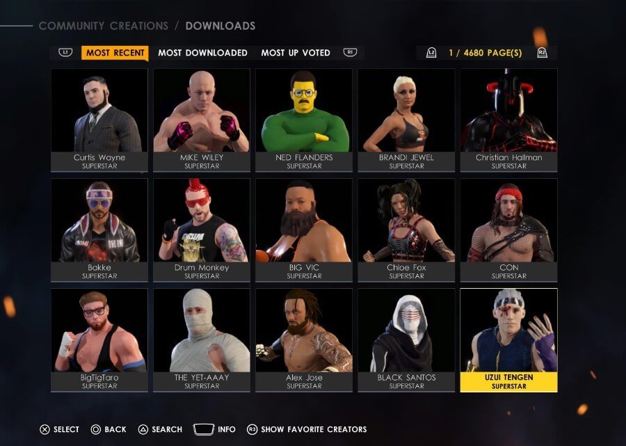 Creations 제품군의 다른 쪽은 Community Creations입니다. 여기에서 다른 WWE 2K 게이머가 업로드한 모든 크리에이션을 볼 수 있습니다.