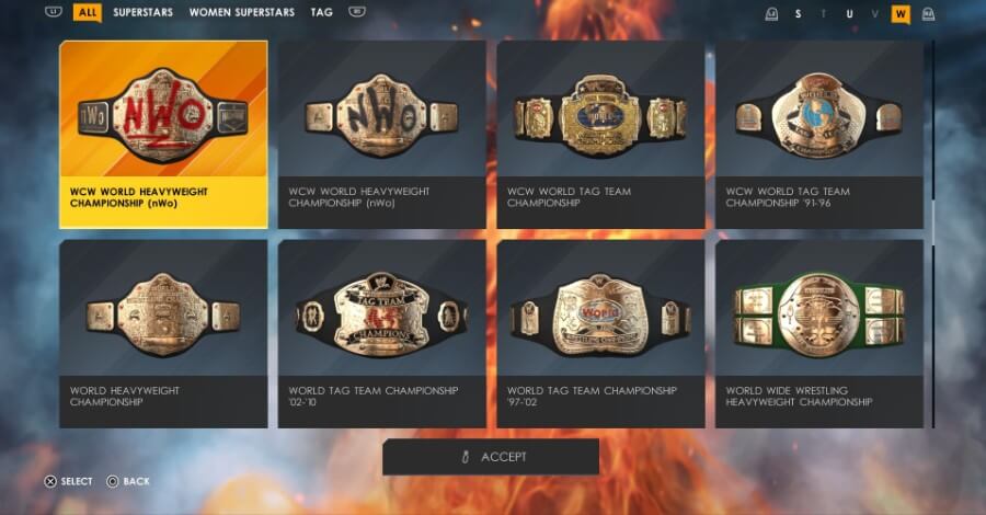 WWE 2K22에는 현재 WWE에서 사용 중인 타이틀부터 WCW 월드 헤비웨이트 챔피언십 및 WWWF(월드 와이드 레슬링 연맹)의 nWo 및 Wolfpac 버전을 포함하여 다양한 프로모션의 역사적인 타이틀까지 할당할 수 있는 수많은 챔피언십이 있습니다. 헤비급 챔피언십. 그렇기 때문에 더 많은 타이틀을 선택할 수 있도록 쇼케이스를 간소화하는 것이 좋습니다.