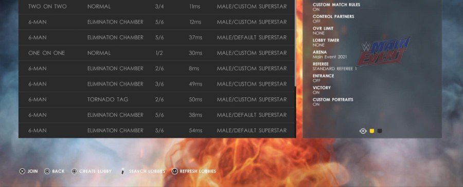 로비에서 열려 있는 다양한 방(경기), 각 방에 있는 방 수 및 각 경기 유형을 스크롤할 수 있습니다. 또한 위 그림의 모든 방이 “남성 및 맞춤형 슈퍼스타”로 설정된 상태에서 남성 또는 여성 레슬러를 선택할 수 있는지 확인할 수 있습니다.