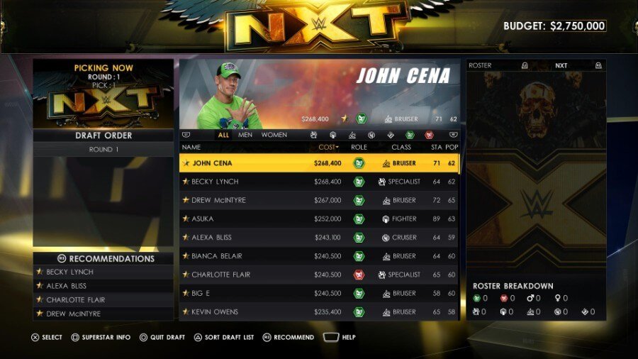 범례를 포함하여 드래프트 풀에 참여하거나 참여하지 않을 사람을 설정할 수 있습니다. 그러나 자격이 있다고 해서 드래프트 풀에 포함되는 것은 아닙니다. 예를 들어, 사진의 드래프트 풀에서 Roman Reigns와 Brock Lesnar는 모두 자격이 있음에도 불구하고 결석합니다. 원하는 레슬러가 표시되지 않으면 표시될 때까지 다시 시작하세요.