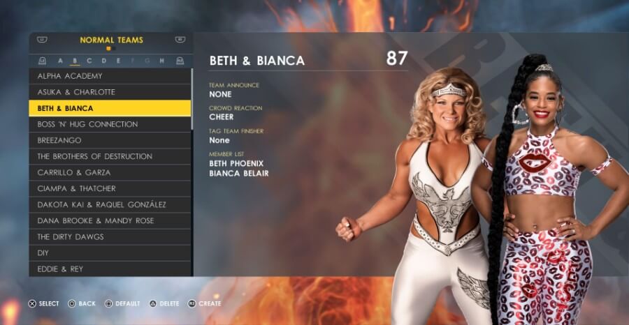 먼저 이 팀들은 게임에 등록하지만 Play Now에서 자신의 팀을 만들 수 있습니다. 둘째, 있다 혼성 태그 팀 없음. 이것은 주로 고려된 남녀 태그 팀 부문 모두에서 많은 페어링 때문이었습니다. 셋째, 나열된 대부분의 팀 실생활에서 팀을 이루어, 하지만 실제로 WWE 프로그래밍에 참여하고 있는 팀은 단 한 팀뿐입니다. 마지막으로 팀은 팀 이름의 알파벳 순서로 나열됩니다.