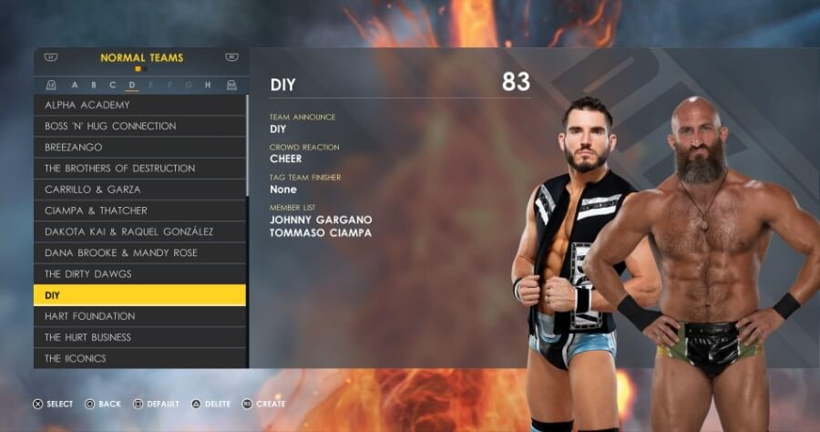 Ciampa는 둘 중 더 냉혹한 사람이지만 DIY에서 보여주듯이 둘 다 빠르고 서로를 잘 칭찬합니다. 그들은 또한 태그 팀 이름이 WWE 2K22에서 발표를 위해 실제로 등록된 이 목록의 첫 번째 팀이기도 합니다.
